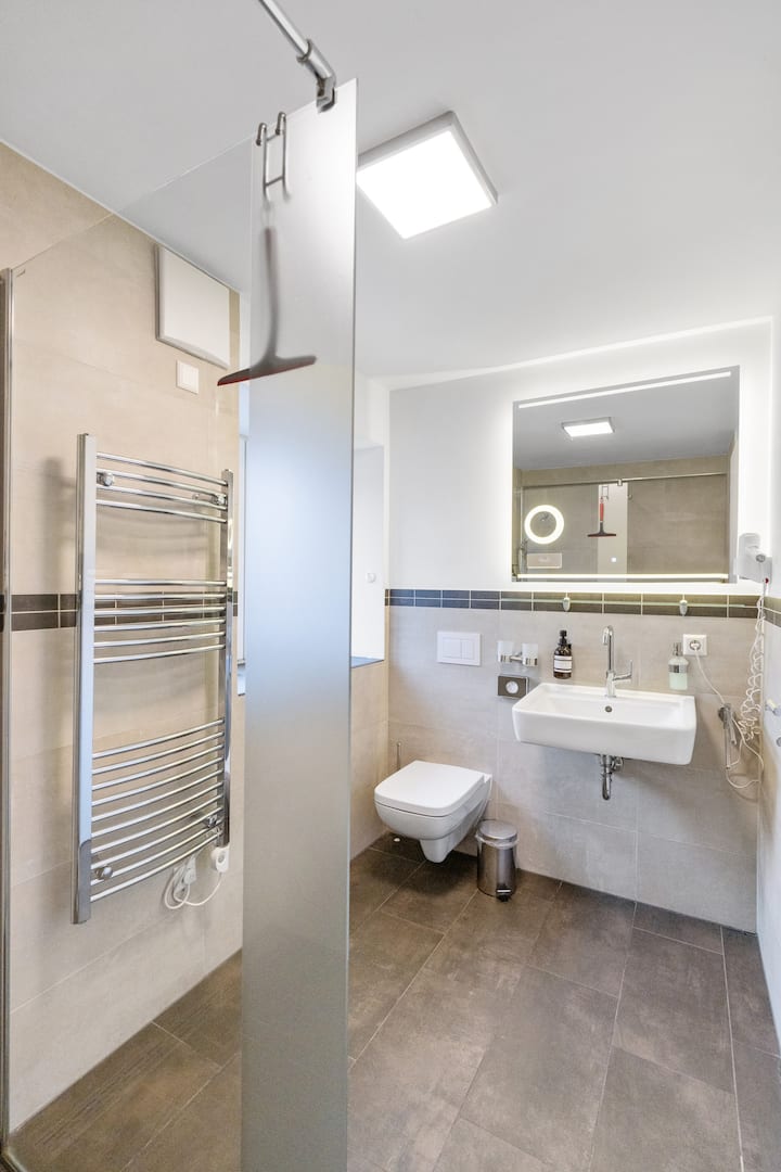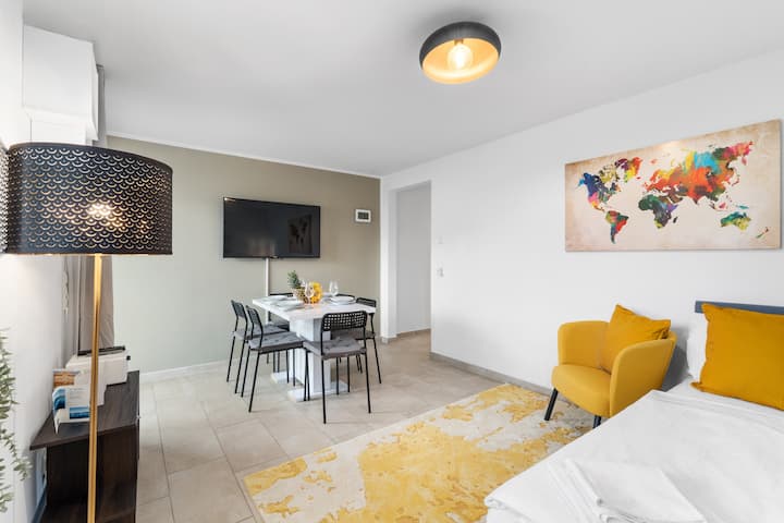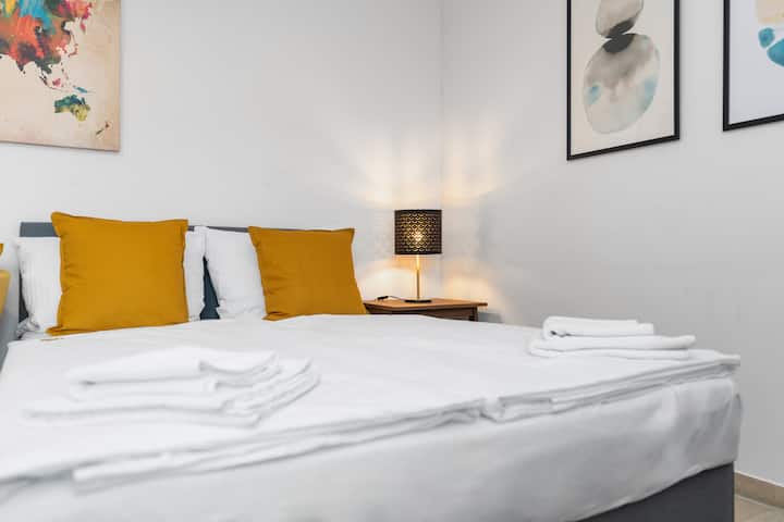 Unser geräumiges Apartment verfügt über drei einladende Zimmer: Zwei Schlafzimmer, jedes mit einem komfortablen Doppelbett, und ein großzügiges Wohnzimmer. Im Wohnzimmer finden Sie neben einem weiteren Doppelbett eine gemütliche Sitzgelegenheit und einen modernen Fernseher, der für unterhaltsame Abende sorgt. Diese durchdachte Einrichtung bietet Platz für bis zu 6 Personen und sorgt für eine warme, heimelige Atmosphäre.