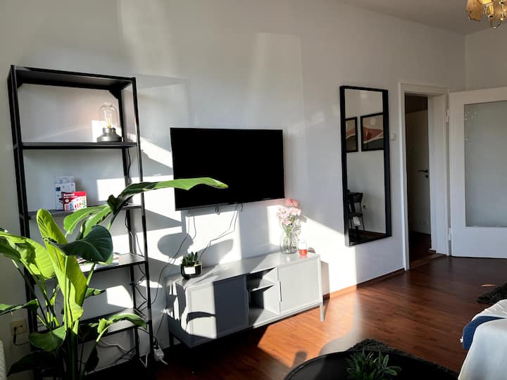 Die erstaunlich große, hochmoderne Neubauwohnung verfügt über einen großen HD Smart TV.