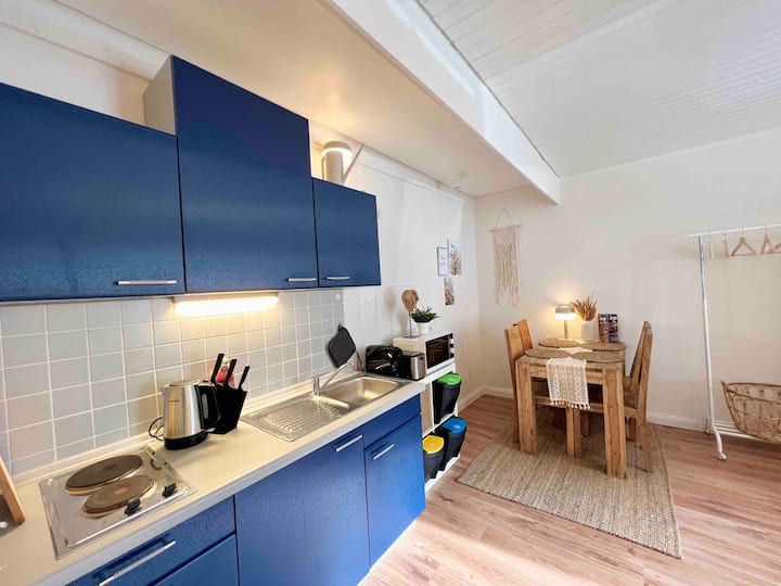 Es gibt eine Kaffeemaschine, Toaster, Mikrowelle, ein Herd, ein Kühlschrank als auch 2 gemütliche Betten für Sie zur Verfügung.